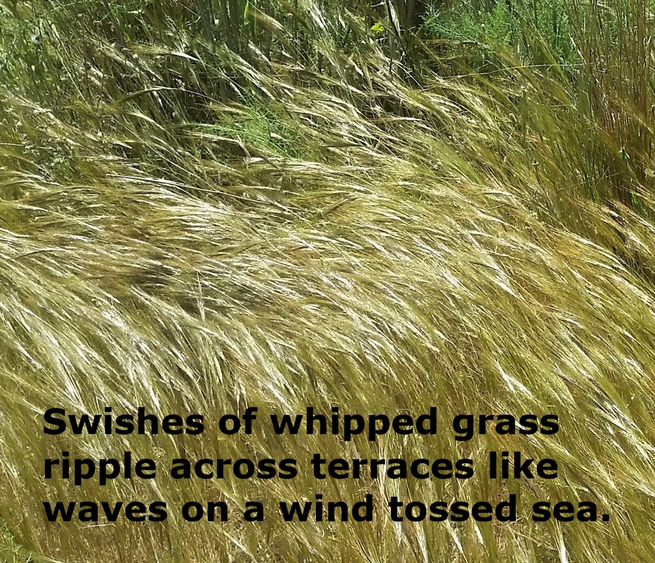 I stood mesmerised by the movement of the wind through this patch of long grasses. The changing patterns and colours reminded me of the hypnotic effect of the wind on water, waves building and crashing on the shore or whipped up waves rippling over the surface of a lake.